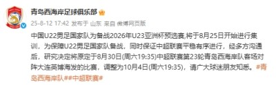中国U22男足国家队为备战2026年U23亚洲杯预选赛,将于8月25日开始进行集训,为保障U22男足国家队备战,同时保证中超联赛平稳有序进行,经多方沟通后,研究决定将原定于8月30日(周六19:35)中超联赛第23轮青岛西海岸队客场对阵大连英博海发的比赛,调整为10月4日(周六19:35),请广大球迷朋友知悉。