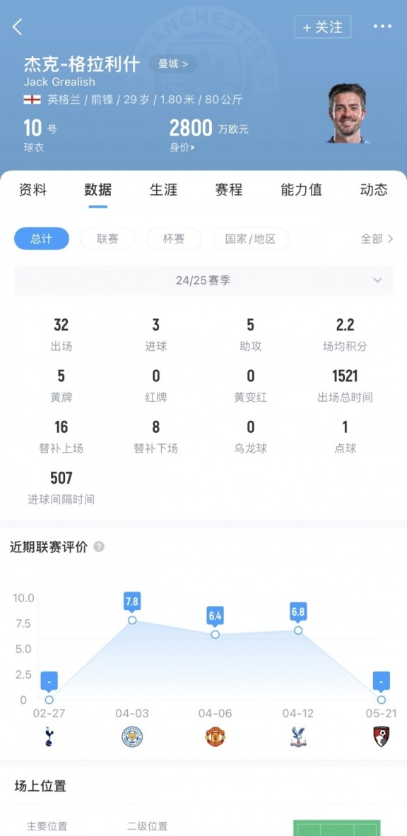 格拉利什整个2024/25赛季只在英超首发7次,他也没有随队参加上个月的世俱杯比赛。截至目前球员共为曼城出场157次打入17球23助攻。
