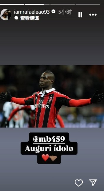 莱奥在社交媒体上晒出了巴洛特利身穿米兰球衣的照片,配文写道:“祝贺你,偶像!”